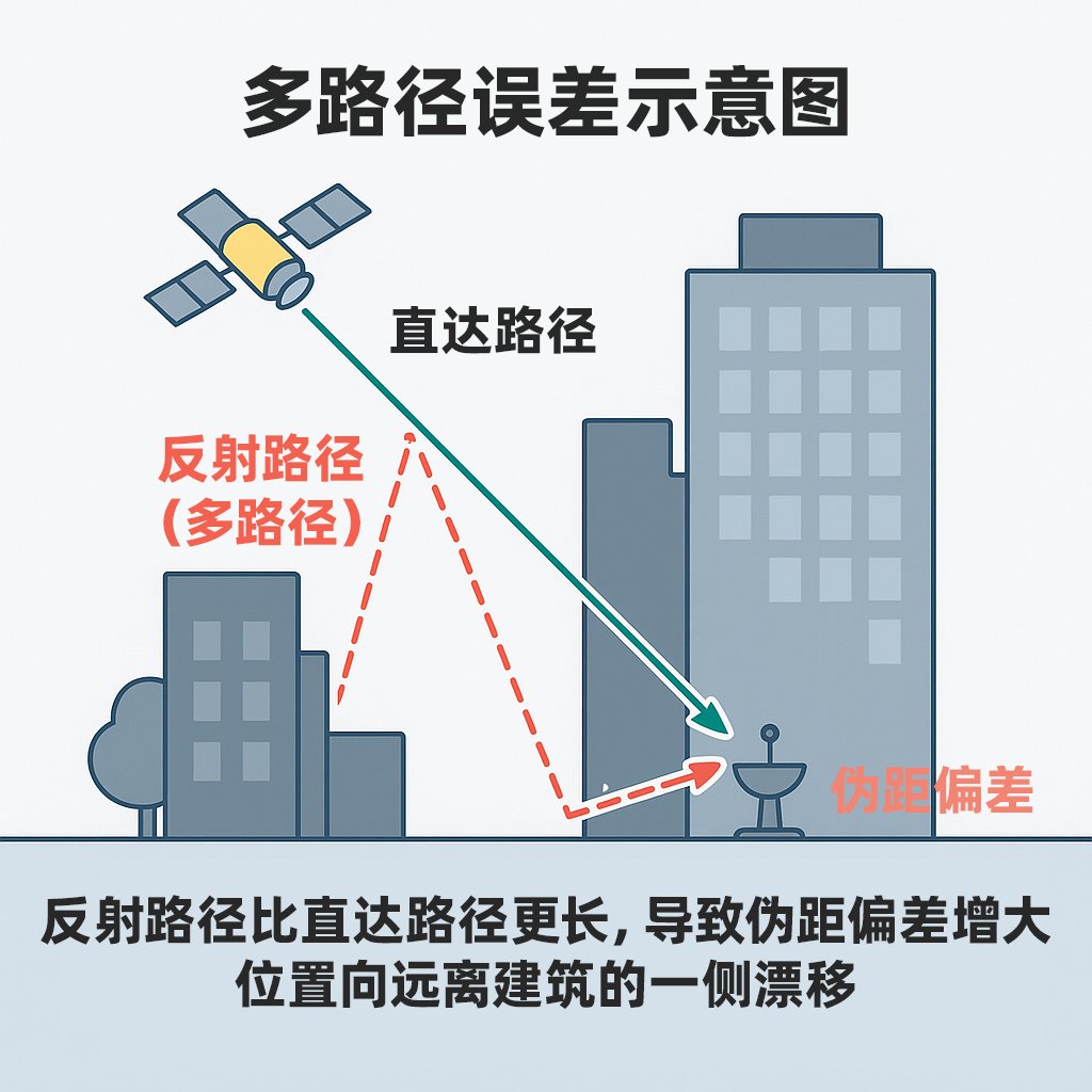 在空旷环境中,卫星信号笔直抵达接收机;但在城市“峡谷”中,信号会被高楼反射,多路径效应让接收机“听到”虚假的距离。
