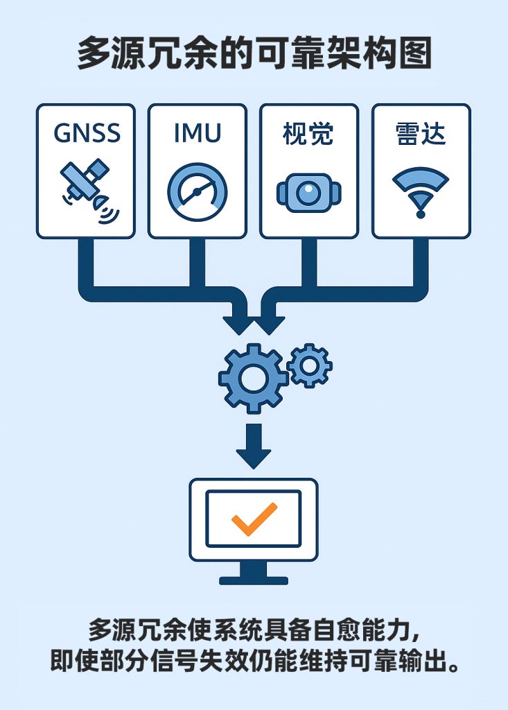 - 多传感冗余:GNSS、IMU、视觉、雷达相互补偿;