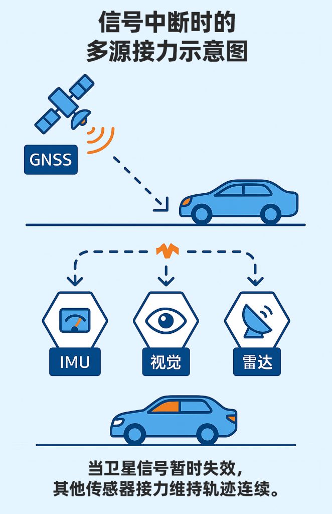 等到信号恢复时,再通过 GNSS 修正累积误差。