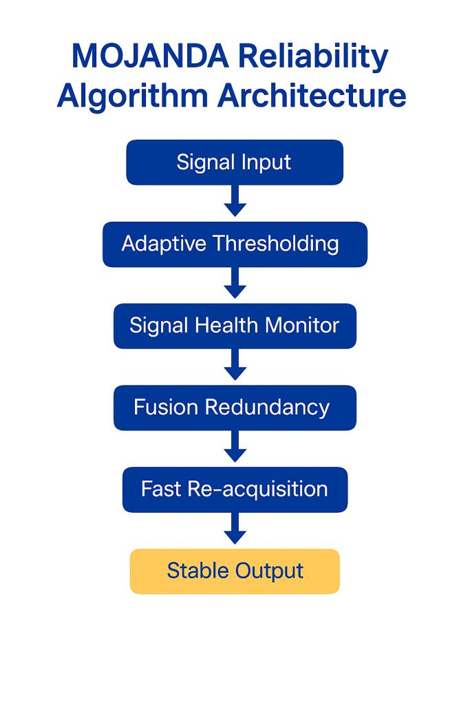 1️⃣ 稳定性(Stability) 在复杂环境下,系统输出是否平滑且可控。 它衡量的是系统能否“稳得住”。 在 MOJANDA 芯片中,稳定性体现在 三频融合算法 与 抗干扰滤波机制, 即便在城市峡谷或弱信号环境中,也能持续保持平稳输出。